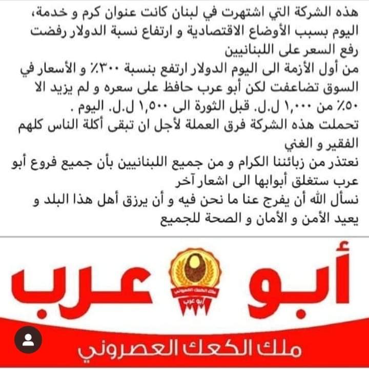 تحملت هذه الشركة فرق العملة لأجل ان تبقى أكلة الناس كلهم الفقير والغني. نعتذر من زبائننا الكرام ومن جميع اللبنانيين بأن جميع فروع أبو عرب ستغلق أبوابها الى اشعار آخر.