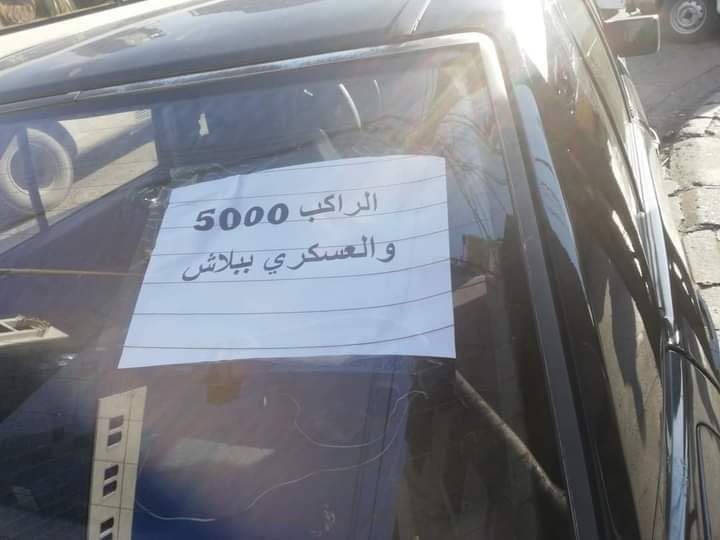 انتشرت صورة على مواقع التواصل الاجتماعي، تظهر تعليق سائق سيارة ورقة، كتب عليها: "الراكب 5000 والعسكري ببلاش".