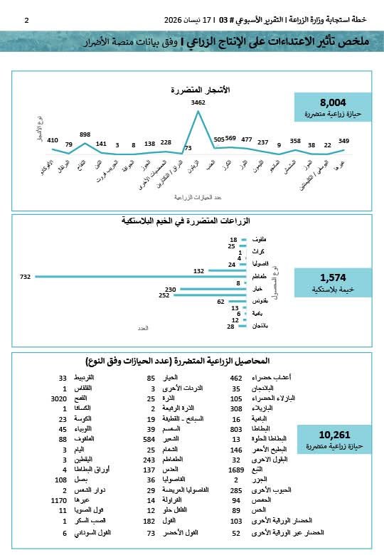 – الأضرار طالت مختلف المحاصيل الأساسية (القمح، الخضروات، البقوليات والتبغ)، إضافة إلى خسائر كبيرة في الزراعة داخل البيوت البلاستيكية، ما يهدد الموسم الزراعي الحالي والمقبل.