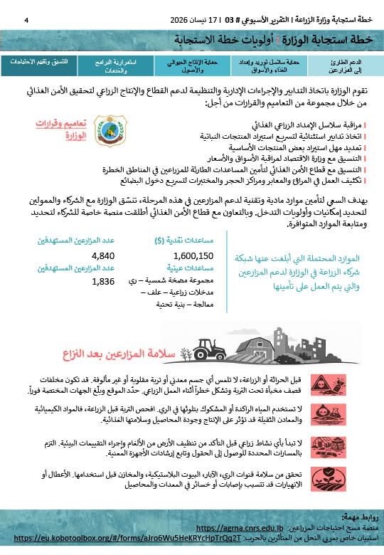 – أكثر من 10,261 حيازة زراعية تضرّرت، فيما توقفت أعمال 78% من المزارعين في الجنوب، وبلغت نسبة النزوح 76.8%، ما يعكس أزمة غير مسبوقة تهدد استمرارية الإنتاج.